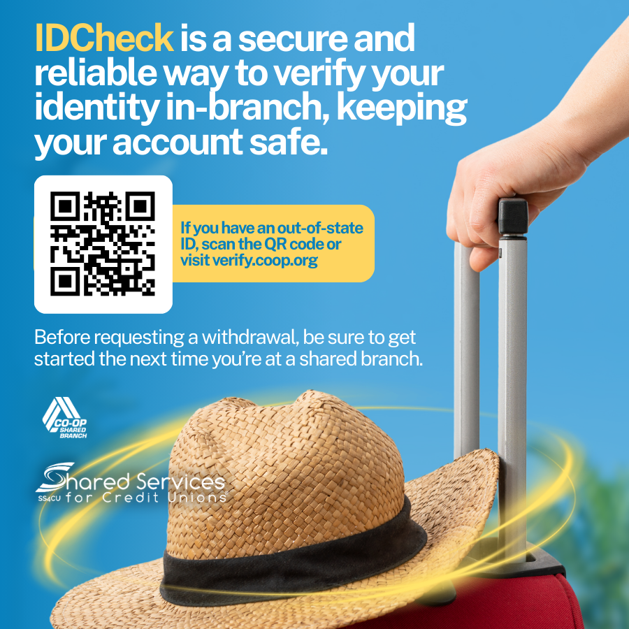 IDCheck is a secure digital identity verification solution. It helps confirm that you are who you say you are before completing a transaction at another credit union through the Shared Branch network—reducing the risk of fraud from fake IDs.