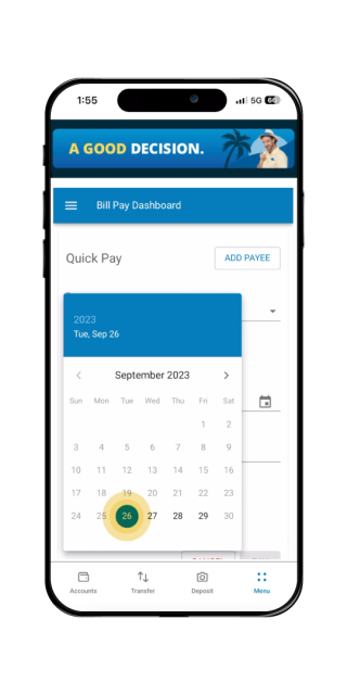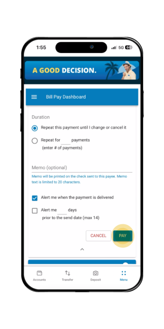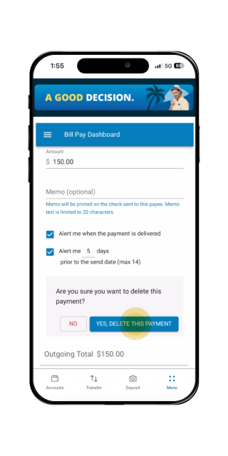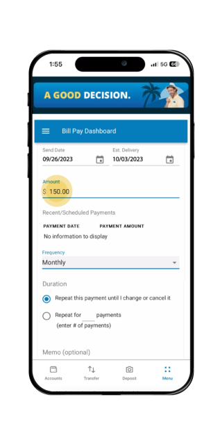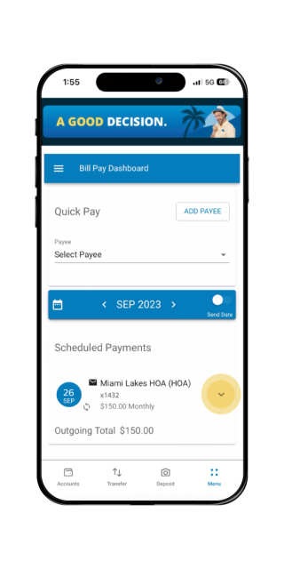 Scheduled Payments will appear under the Bill Pay Dashboard.